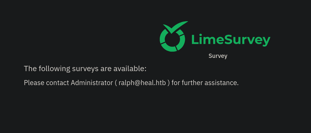 En la propia web encontramos otro subdomonio al hacer click sobre survey, nos redirige a take-survey.heal.htb. Si añadimos estos dos subdominios al /etc/hosts podremos ver de qué se trata.